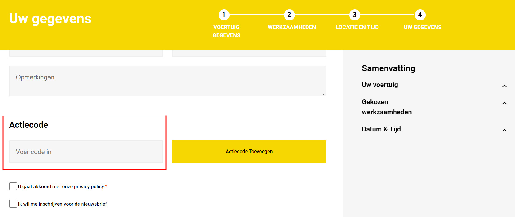 Apk-afkeurpunten moeten (indien nodig) bij ons worden uitgevoerd om de korting te activeren. De code kan maximaal twee keer per (rechts)persoon gebruikt worden.